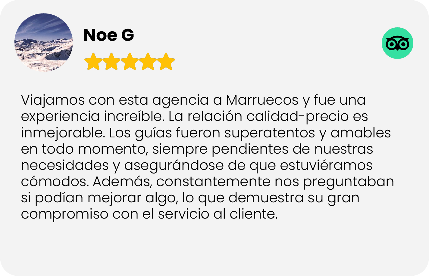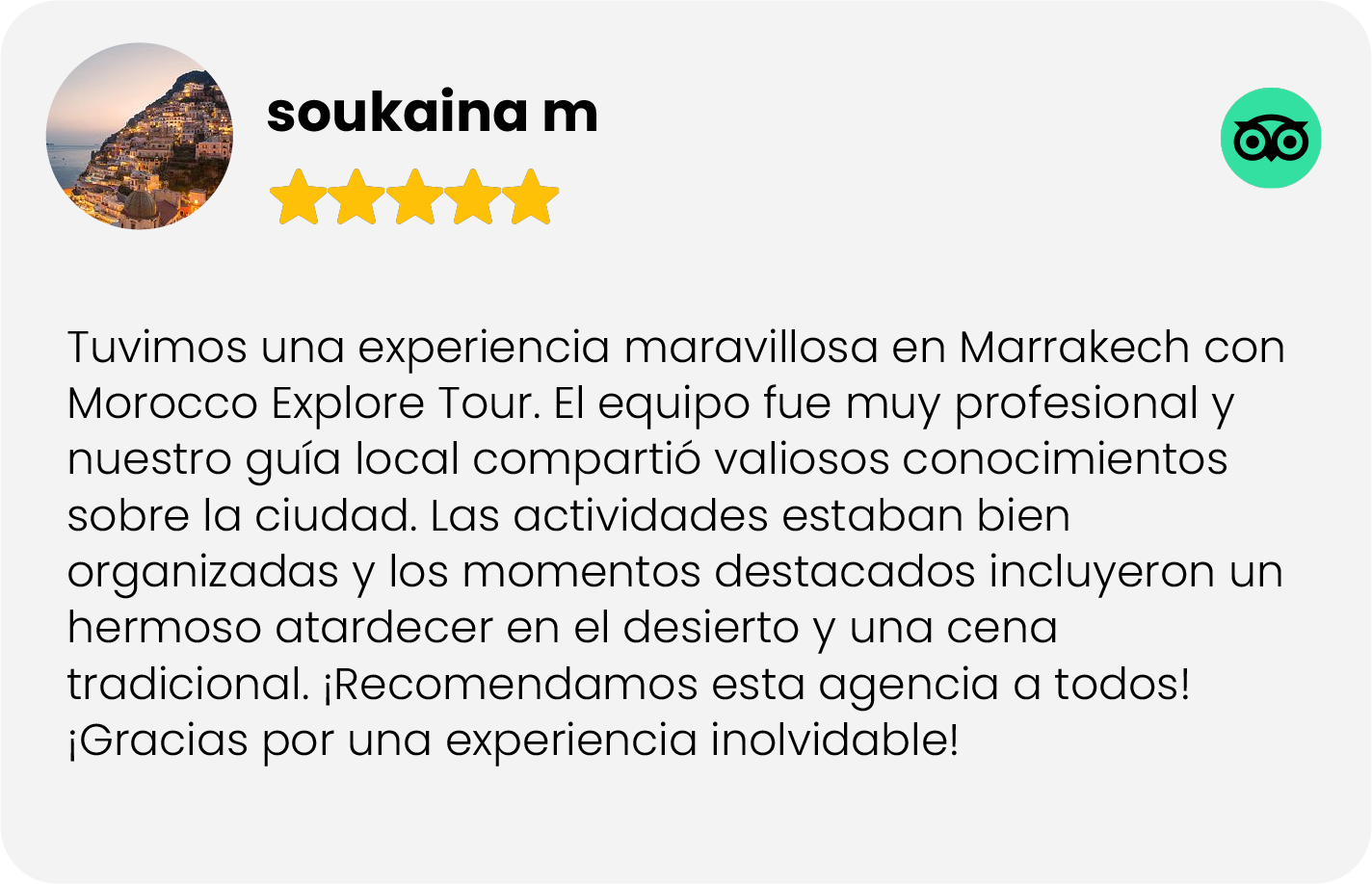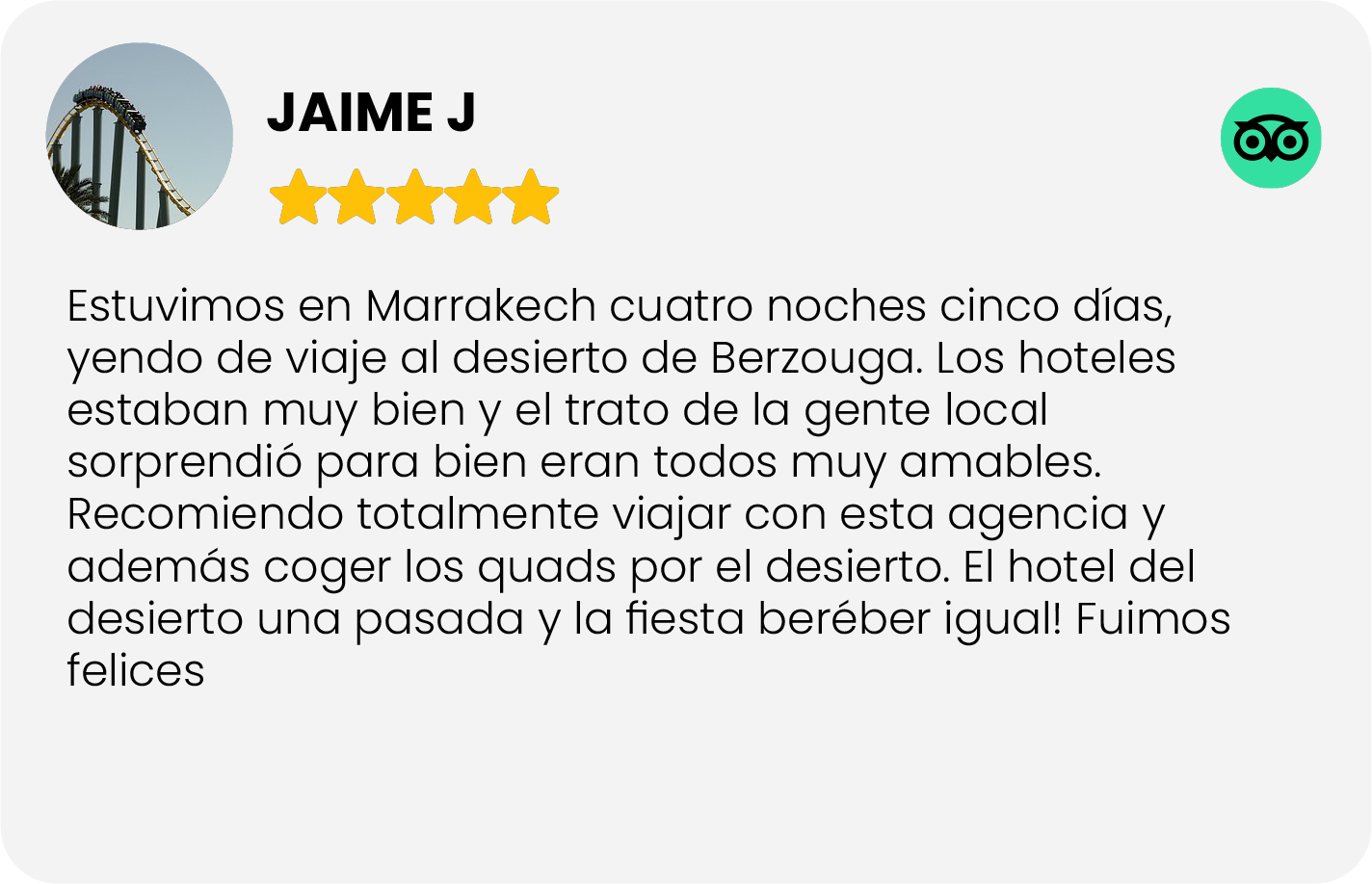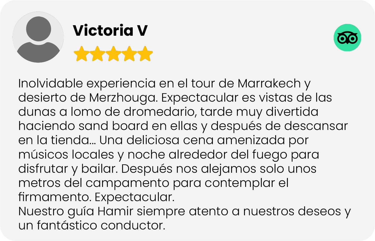 - Si tienes cualquier otra pregunta sobre nuestro tour en grupo de 5 días desde Marrakech al desierto de Merzouga, no dudes en contactarnos. Te responderemos en un plazo de 24 horas. Para una comunicación más rápida, puedes escribirnos por WhatsApp +212673051060.